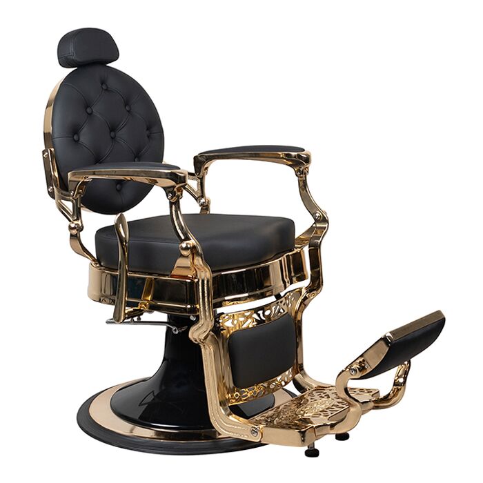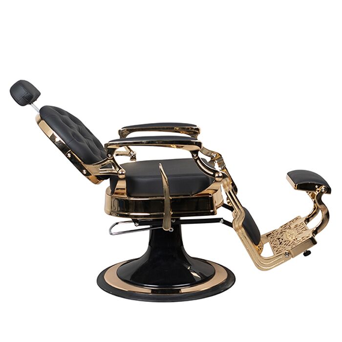 The seat and backrest are upholstered in premium black PU vinyl with dense cushioning, delivering a firm yet comfortable feel suited to professional barbering. An adjustable inner headrest, supportive calf rest, and padded armrests ensure clients are well supported throughout every service, while the sculpted gold frame and detailed footrest add a strong sense of character and craftsmanship.