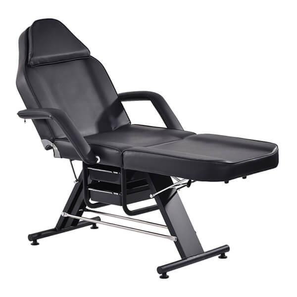 The bed smoothly converts from an adjustable chair into a fully flat treatment bed by manually adjusting the backrest and leg sections, making it suitable for a wide range of beauty and aesthetic treatments. It features two (2) convenient slide-out trays for tools and accessories, along with a sturdy steel base supported by locking pins and four (4) adjustable rubber feet for excellent stability.