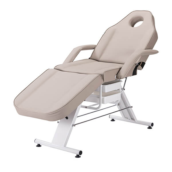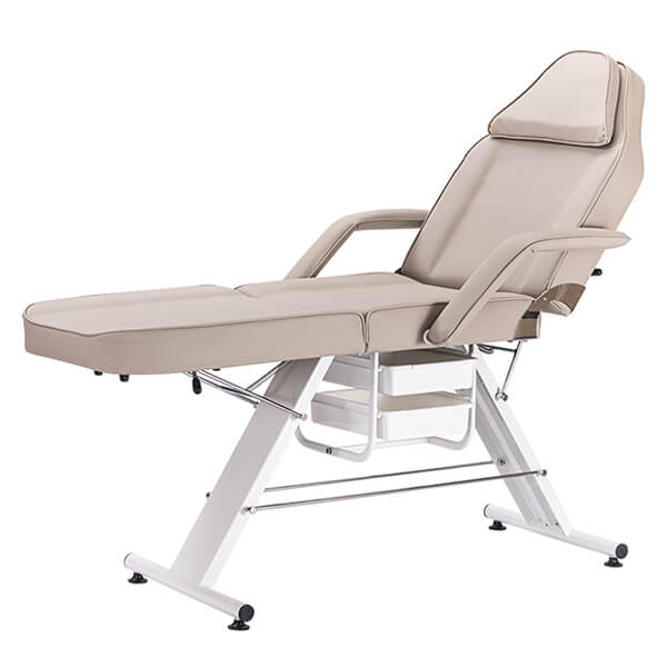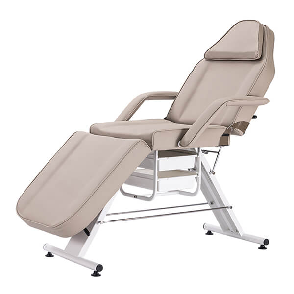 The bed smoothly converts from an adjustable chair into a fully flat treatment bed by manually adjusting the backrest and leg sections, making it suitable for a wide range of beauty and aesthetic treatments. It features two (2) convenient slide-out trays for tools and accessories, along with a sturdy steel base supported by locking pins and four (4) adjustable rubber feet for excellent stability.