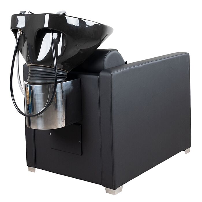 The ceramic wash basin features an adjustable tilt mechanism, allowing precise positioning for different clients. Supported by a stainless steel pedestal, the basin setup is both stable and easy to maintain. The design also allows hair to be washed comfortably from either the back or the side of the unit, giving added flexibility in busy salon environments.