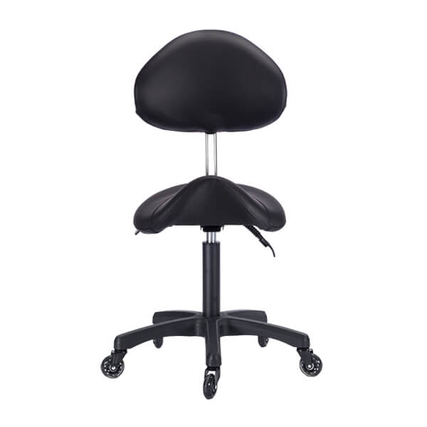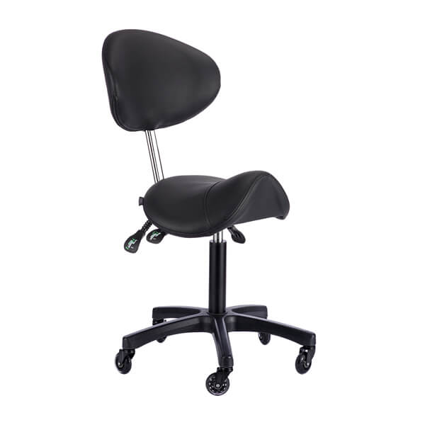The anatomically contoured saddle seat gently tilts the pelvis to encourage a natural, healthy seating position, helping reduce lower-back strain. Equipped with three gas-lift levers, the stool allows effortless adjustment of height, seat tilt, and backrest for complete ergonomic control.